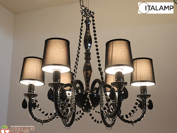 ブラックガラスに黒いセードを組み合わせたシックな印象のシャンデリア。重厚感のなかにもチェーンライトストーンでエレガントな装いをプラスしています。