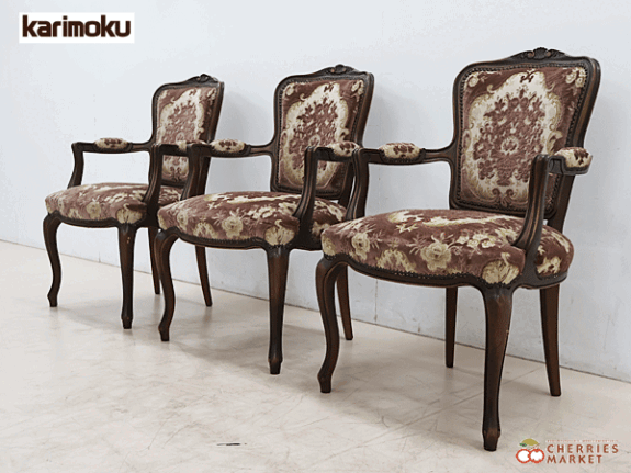 【Karimoku】カリモク 金華山張 ダイニングチェア/アームチェア 3脚セット ロココ調 猫脚 です。