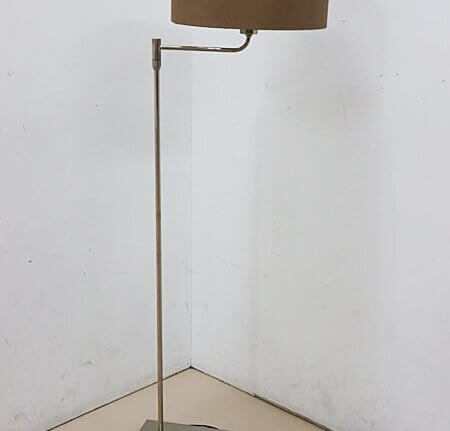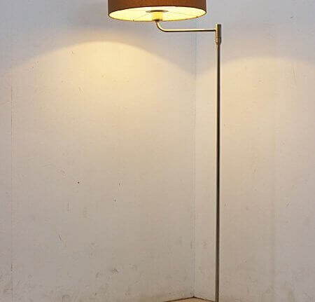 垂直なステンレスのスタンドから首振りで横に伸びるアームに、小振りなシェードが自在に動くフロアスタンドです。