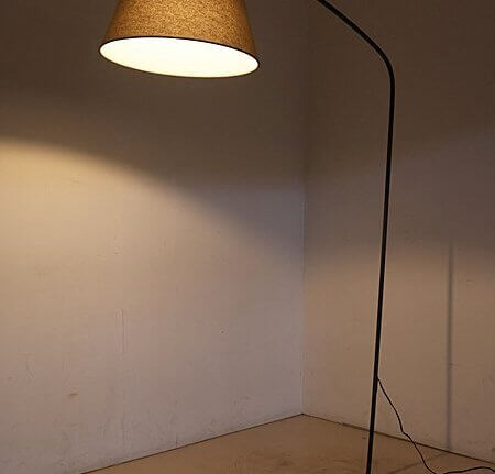 シェードへと伸びるアームからベースに至るまでを1本の美しいラインからトレースしたダイナミックなサイズ感のフロアライト。