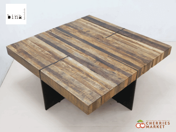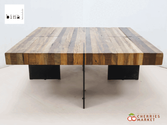 色味の違う廃材を細かくつなぎ合わせることにより、実に表情豊かなストライプの天板が出来上がります。脚の形状もユニークなローテーブルです。